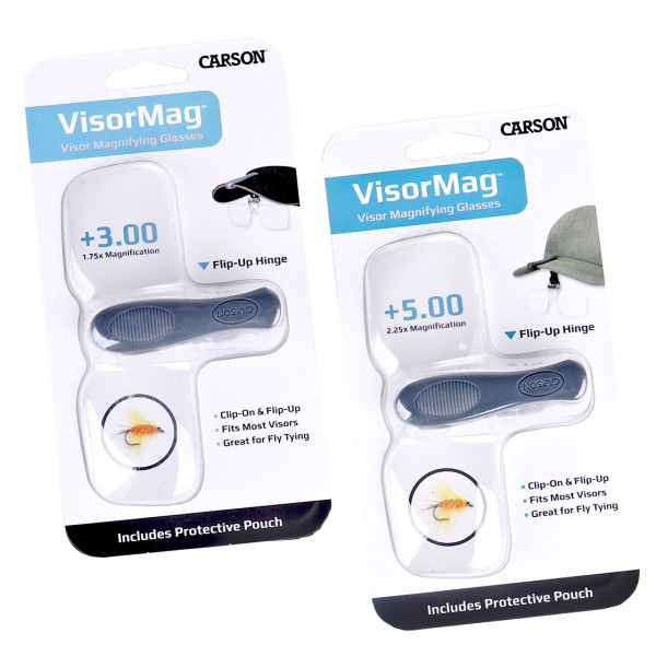 The VM-14, VisorMag™ 2.25x Power 5.00 Diopters Clip-on Magnifying Lens for Hats or Caps is a set of clip-on, flip-up magnifying glasses that attach to the brim of most caps and hats. Perfect for fly-tying and all fly-fishing needs. Complete with protective soft-pouch, its crystal clear acrylic lenses give you a sharp, distortion-free view that allows you to see even the finest details with ease. These magnifying glasses are 2.25x power equivalent to +5.00 diopters. Also available in 2.00x power equivalent to +4.00 diopters.