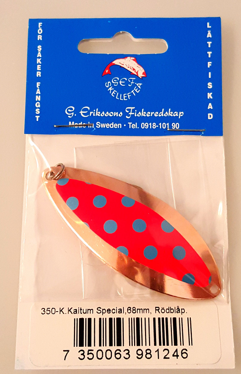 G.Erikssonin Kaitum Special -rautupilkki, pituus:68mm, Väri:Kupari/Punainen/Sinisillä pisteillä.