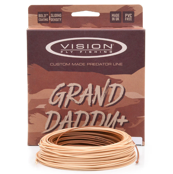 VISION Grand Daddy+ -haukisiima on päivitetty versio suositusta Grand Daddy 85 -perhosiimasta. Se on suunniteltu erityisesti petokalojen kalastukseen ja suurten, ilmavastusta aiheuttavien perhojen heittämiseen. Kuten alkuperäisessä mallissa, siimassa on 8,5 metrin heittopää sekä voimakas etukartio, jotka tekevät kookkaiden haukiperhojen heittämisestä vaivatonta. Uusi pinnoite tekee siimasta nyt entistäkin notkeamman kylmissä olosuhteissa, mikä vähentää juoksusiiman sotkeutumista ja parantaa käsiteltävyyttä. Heittopään painoa on hieman kasvatettu sekä siiman kokonaispituutta alkuperäiseen verrattuna. Raskaampi heittopää helpottaa heittämistä, ja pidempi kokonaispituus varmistaa, että juoksusiima ei lopu kesken. Vähän joustava ydin välittää tärpit tehokkaasti ja helpottaa vastaiskun tekemistä. Lisäksi se siirtää heittoenergiaa tehokkaammin kuin perinteiset ytimet. Valmiit lenkit siiman molemmissa päissä tekevät pohjasiiman ja perukkeen kiinnittämisestä nopeaa ja helppoa.